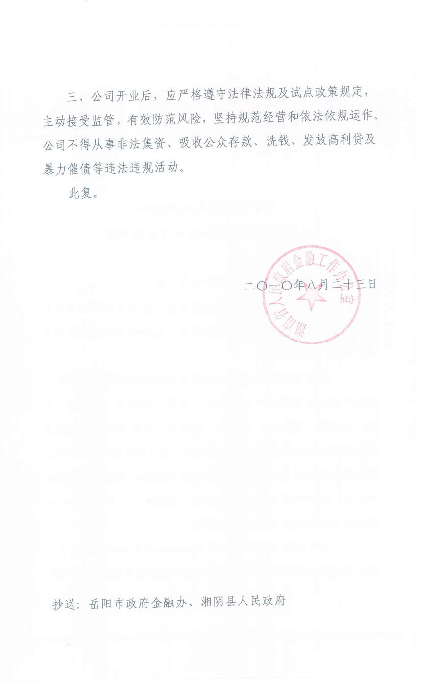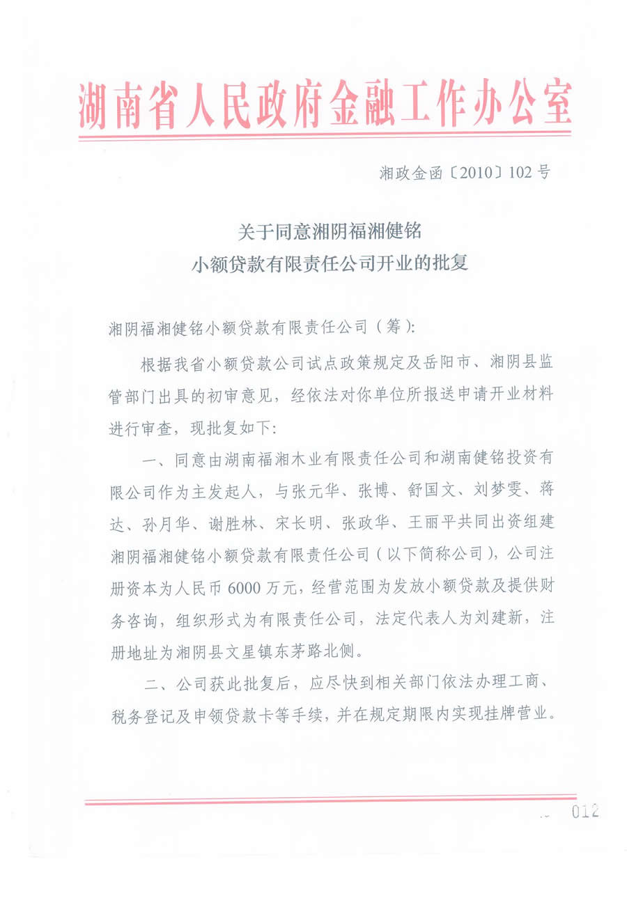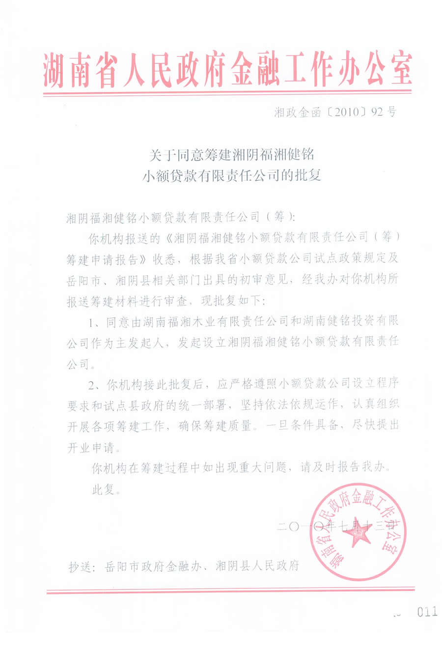 关于同意筹建湘阴福湘健铭小额贷款有限责任公司的批复